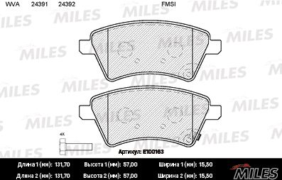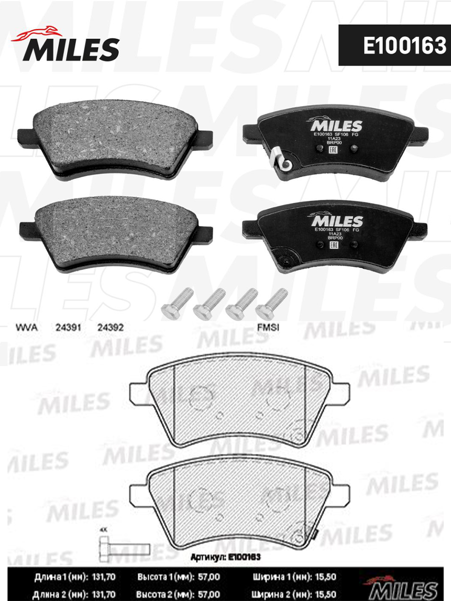 Колодки тормозные передние (без датчика + болты) MILES E100163
